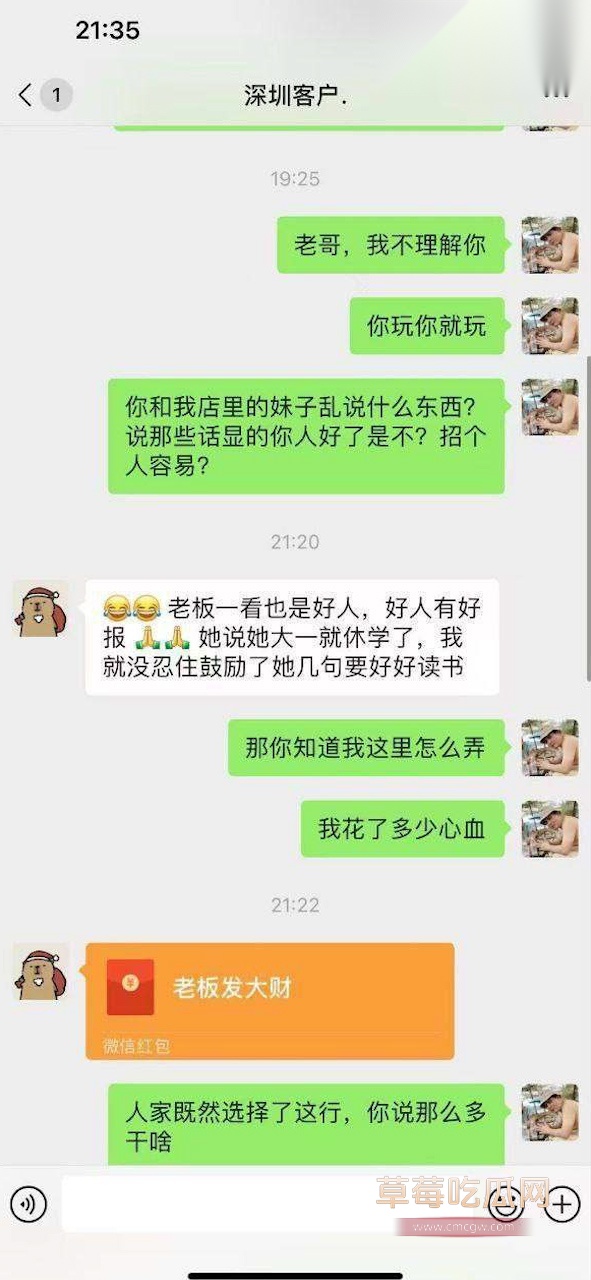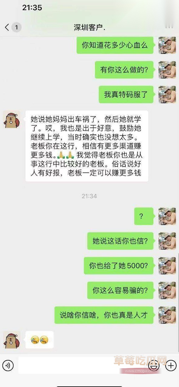 关键词:#深圳嫖客劝小姐从良 #鸡头吐槽 #好人都让他当了 #鸡头辛苦培养的小姐被嫖客劝从良了 #客人爽了 #姑娘跑了 #给妹子转账5000块 #网络吐槽 #吃瓜 #劝鸡从良