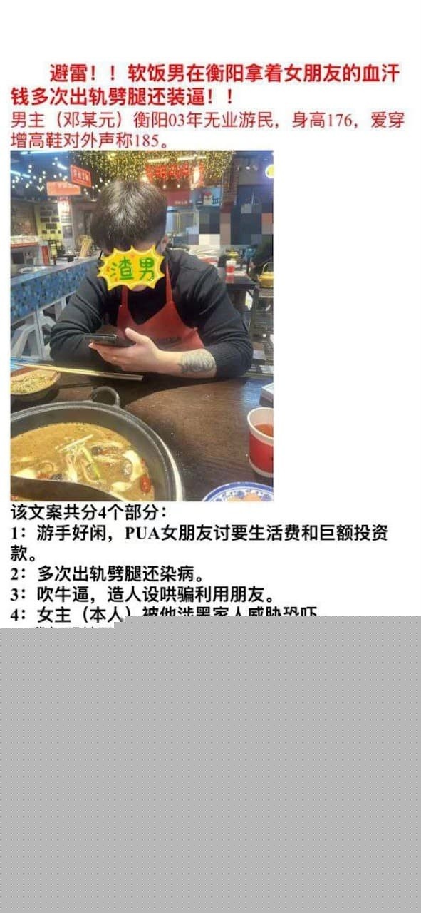 本文《衡阳软饭王被曝光 花光女友积蓄还出轨5人反过来骂女友是穷逼!》源于网络采集,仅代表作者观点,与本站立场无关